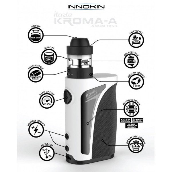 Details: The Innokin iTaste Kroma-A Starter kit comes with an Ultra-Compact 72mm design, features an internal Li-Po battery of 2000mAh that can fire up to 75W, supports Nickel 200, Titanium and Stainless Steel 316 wire in temperature control mode. The Innokin Crios Sub-Ohm Tank is a 4.0ml capacity t..