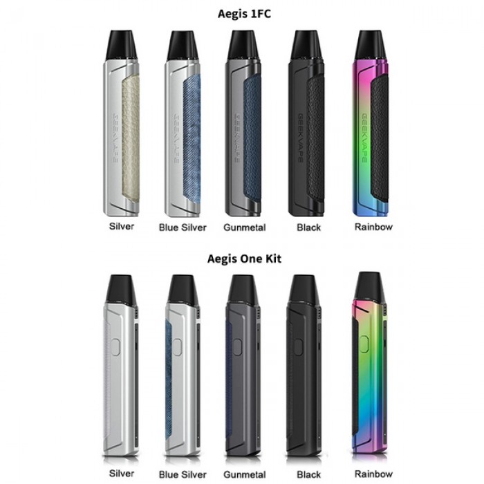 Geekvape Aegis One & 1FC Pod Kit not only looks appealing but also enhances comfortability by its flat pen size body and textured leather. With its extraordinary ‘S-shaped’ design airway, it provides a fun and flavorful experience for both smooth and stronger throat-hit. 1FC Kit is powered by 550mAh built-in battery, and One Kit houses a 780mAh integrated battery, both of them operate within ONE tiny button and allow you to expect several vape sessions by its three output levels, the LEDs will indicate the status of the battery and output level. 1FC is equipped with fast charging design and is promised to fully charge in 15 minutes. One & 1FC Kit receive a 2ml vape juice capacity and supply your e-juice via the top filling system, designed for MTL vaping.