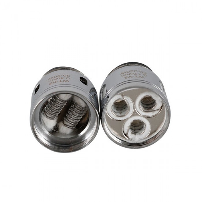 Technical Data:WT-H2 Coil Head: Resistance: 0.4Ω Wattage Range: 30-90W Best Wattage: 50-70W "Regular Coil with RDTA Feeling" WT-V3 Coil Head: Resistance: 0.17Ω Wattage Range: 80-220W Best Wattage: 110-130W "Massive Clouds under High Wattage" Package Includes: 5x wismec kage tank coils..